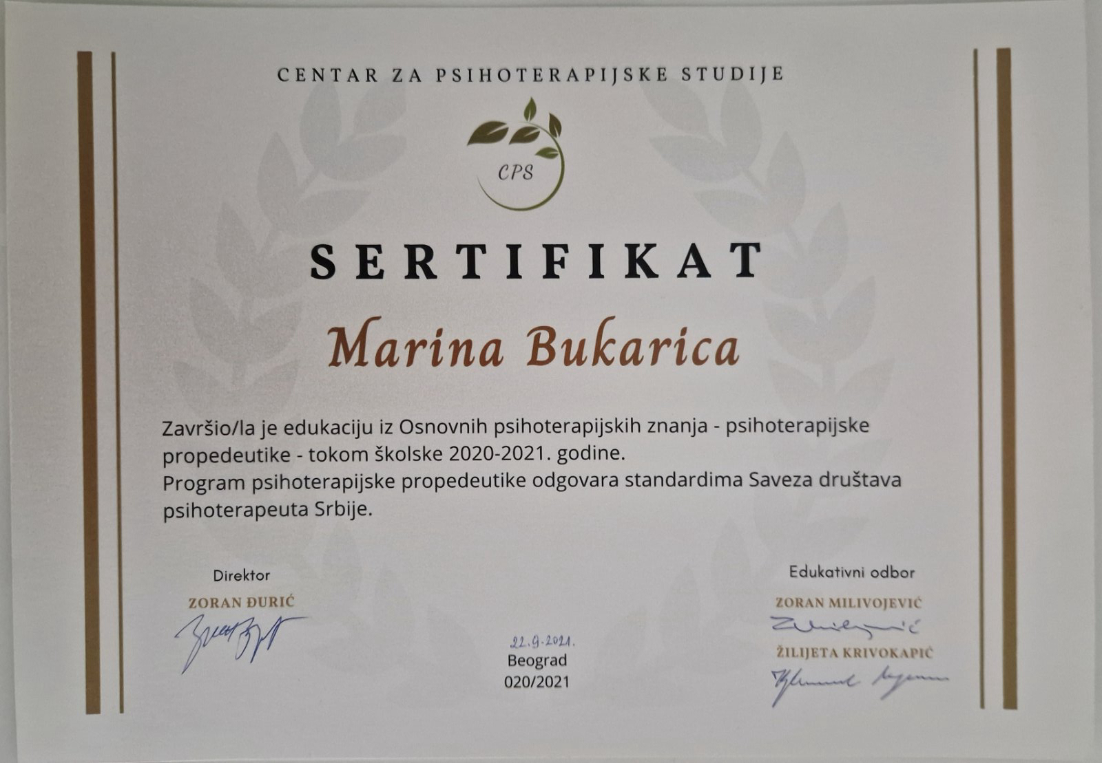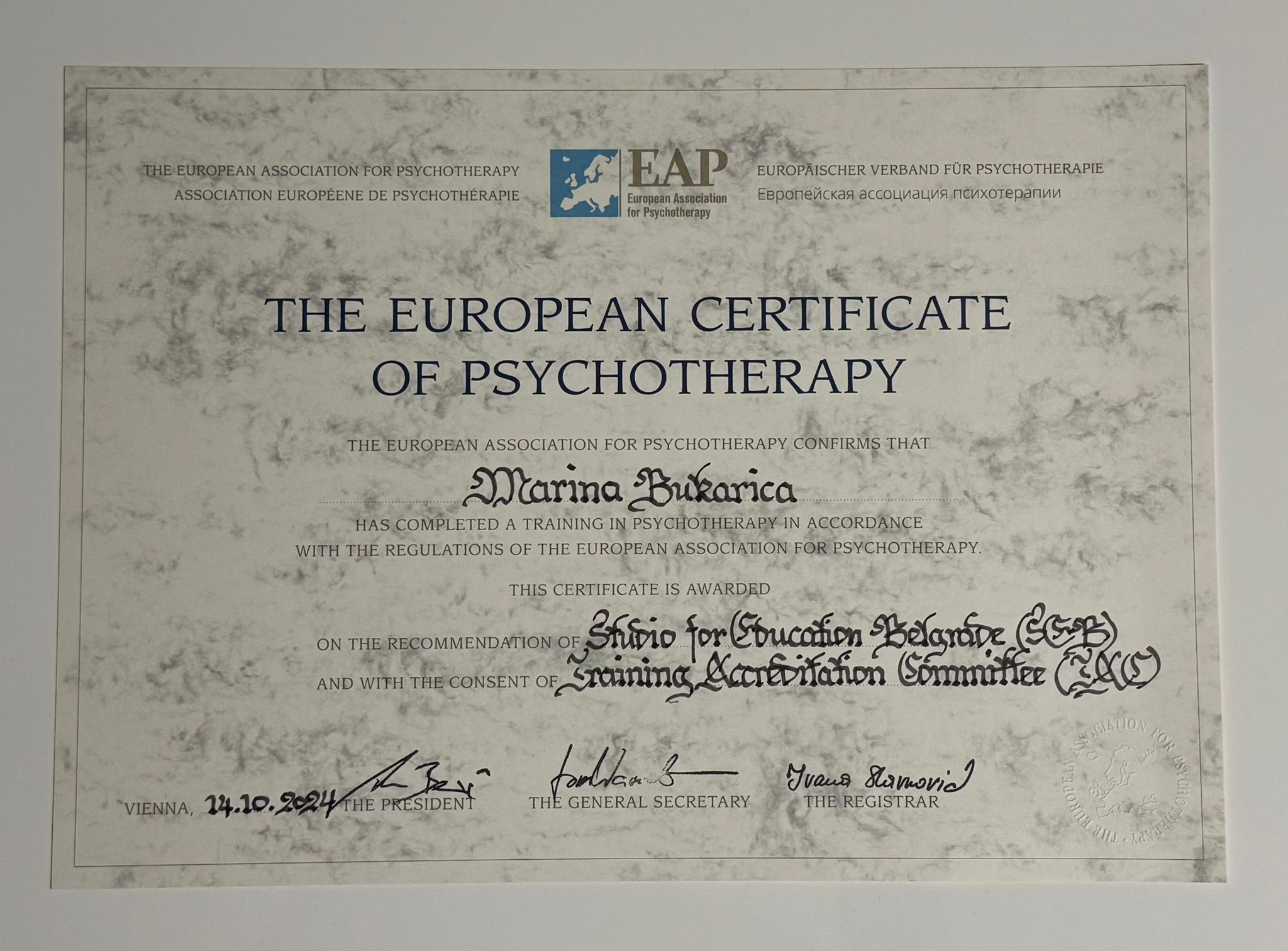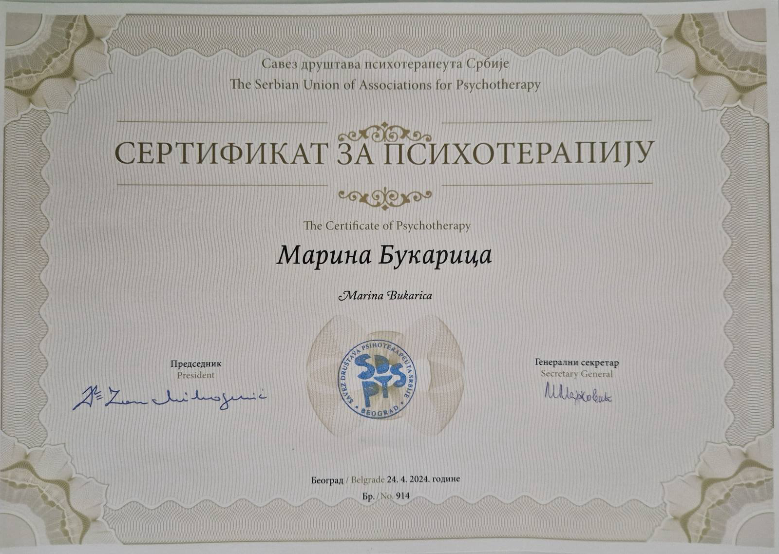 Posedujem diplomu iz Geštalt terapije, nacionalni sertifikat psihoterapeuta Srbije i Evropski